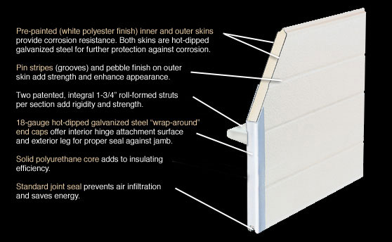 Thermospan 125 doors feature pre-painted inner and outer skins made from hot-dipped galvanized steel for added corrosion protection.The exterior suface is pebbled and grooved, enhancing the appearance while providing improved strength, and each section is reinforced with two 1 3/4" integral roll-formed struts for even greater rigidity. Hot-dipped 18-gauge galvanized end caps offer a superior surface for hinge attachment. Our standard joint seal prevents air infiltration and in conjunction with the solid polyurethane core, offers enhanced energy efficiency.